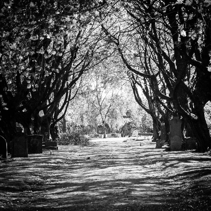 Passing once more under the cherry blossom cloud, I leave the Southern Necropolis and walk up Caledonia Road. I pass a bus stop where a group of pensioners in their Saturday night finery chat loudly among themselves. Across the street, a man tends a garden he’s created outside his ground floor flat. A woman walks her dog. Life goes on. In that moment I’m reminded of Mary Ross’ statement, included in my film, of how one day this will all come to a stop.